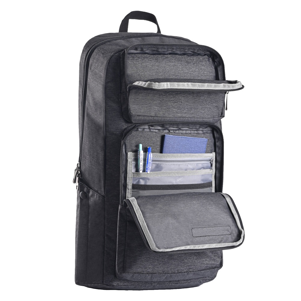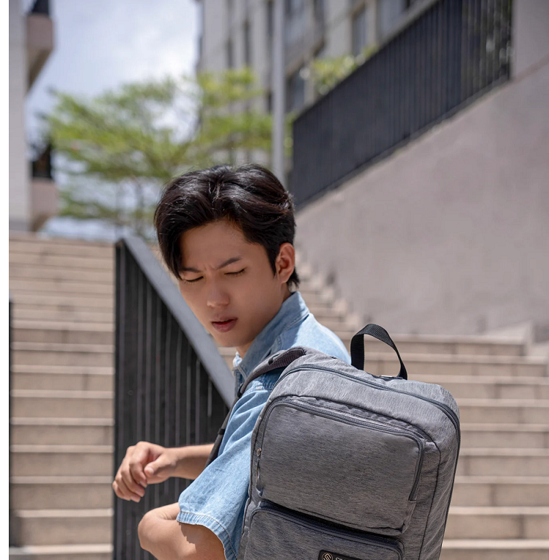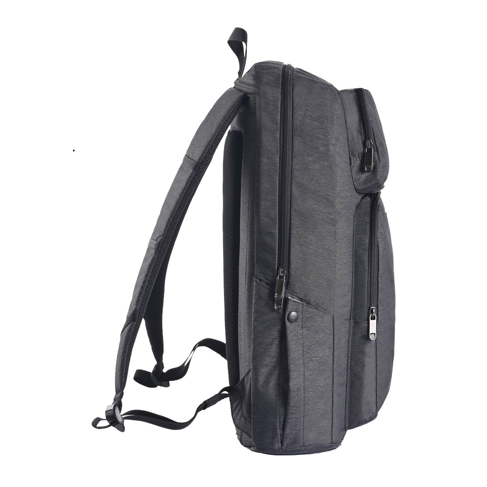Ngăn chính phía trong rộng rãi, có ngăn đựng laptop riêng biệt với lớp mút PE chống sốc, 2 túi hông đựng bình nước.