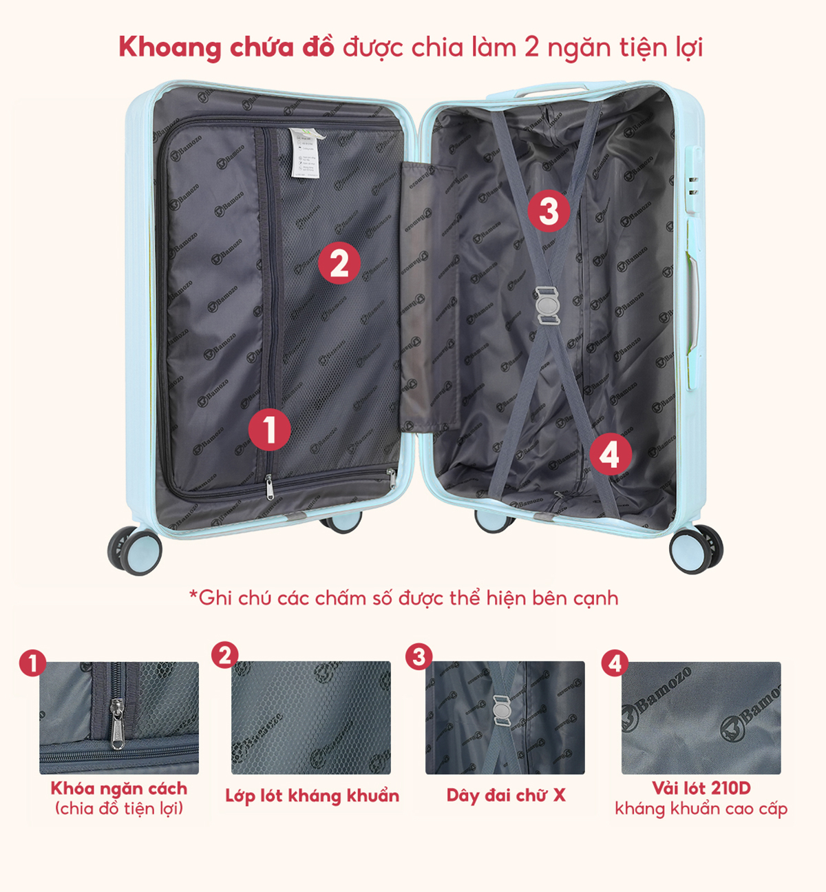 Vali sử dụng lớp lót bằng vải 210D cao cấp, ngăn phụ bằng lưới có khóa kéo, tiện lợi để phân chia đồ đạc và chống sốc cho đồ dùng đựng bên trong.