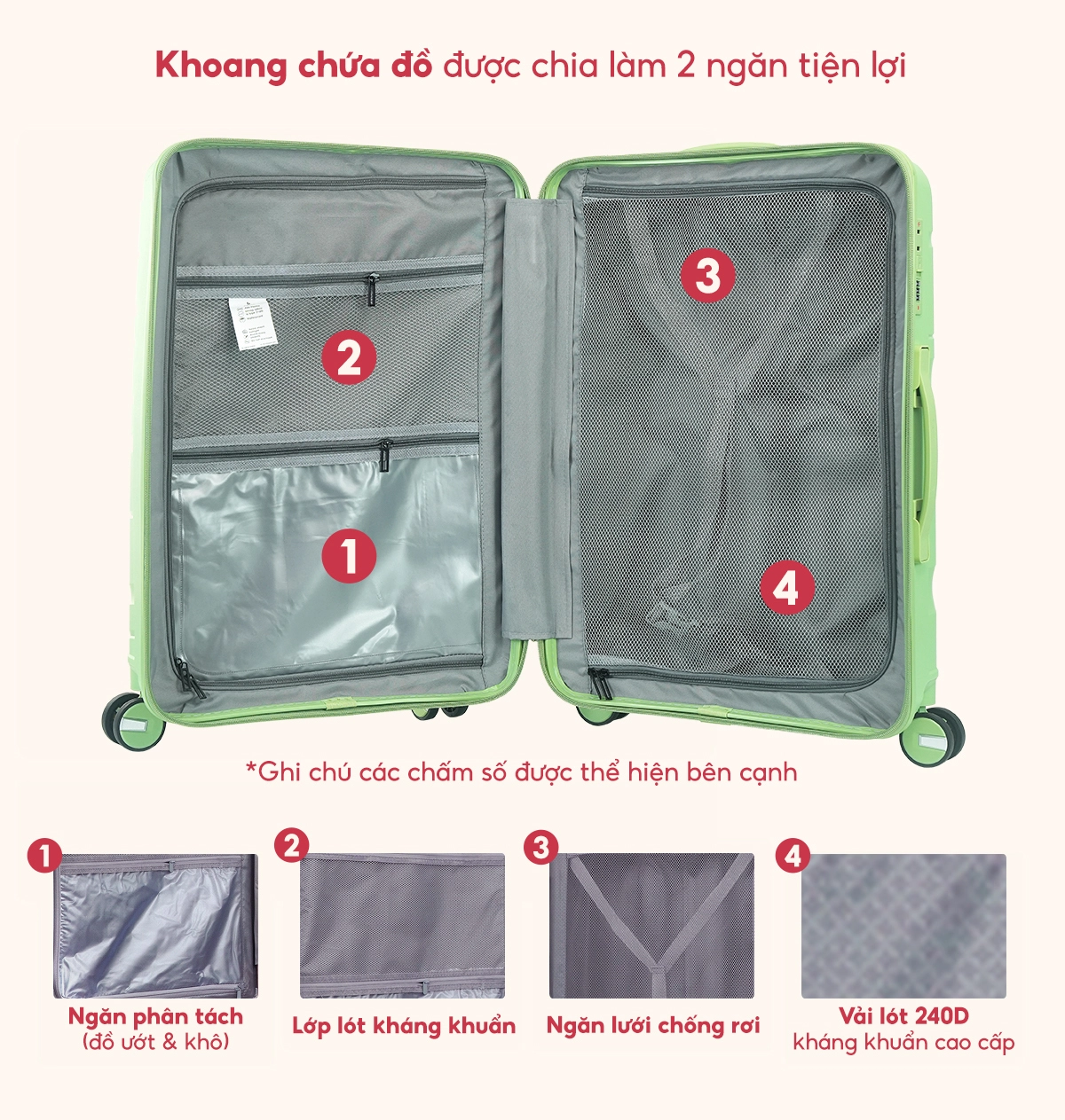 Khóa bảo mật 3 số kết hợp khóa kéo 2 lớp chống rạch, bảo vệ tuyệt đối, chất liệu 100% nhựa PP cao cấp chống vỡ tuyệt đối