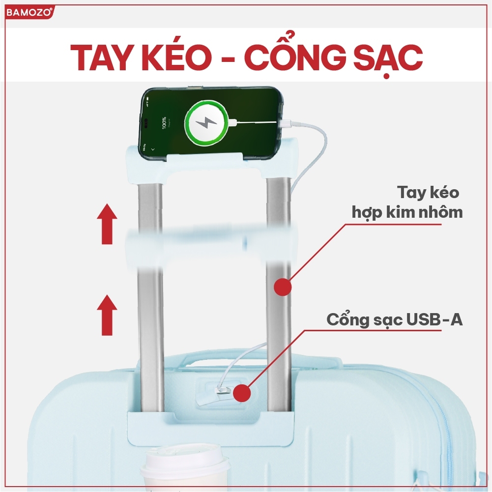Tay kéo vali làm từ sắt mạ chống gỉ sét. Cần kéo có thể thay đổi linh hoạt chiều dài phù hợp vóc dáng người sử dụng giúp tiết kiệm sức lực và chống gù lưng